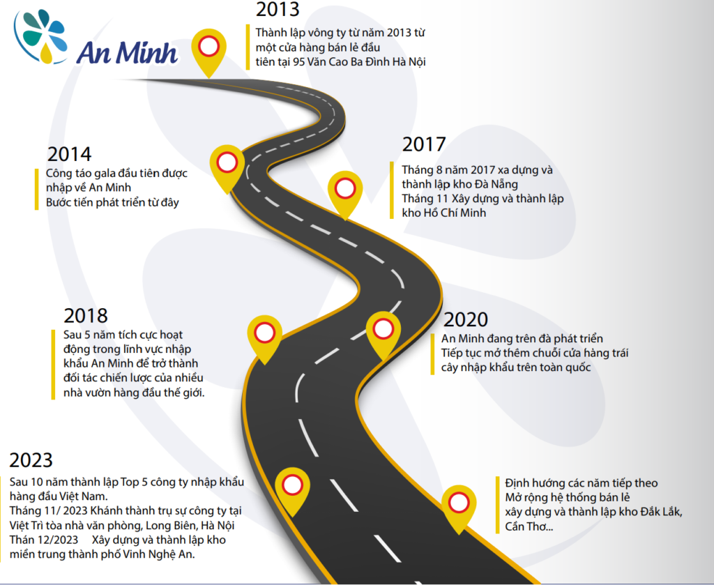 Năm 2013, An Minh nhập khẩu container táo đầu tiên. Đây là một dấu mốc quan trọng, đánh dấu sự khởi đầu của hành trình nhập khẩu trái cây của công ty. Năm 2017, An Minh thành lập kho Đà Nẵng và kho HCM. Việc mở rộng quy mô hoạt động giúp công ty tiếp cận được với nhiều khách hàng hơn. Năm 2022, sau 5 năm hoạt động tích cực trong lĩnh vực nhập khẩu, An Minh trở thành đối tác chiến lược của nhiều nhà vườn trên thế giới.